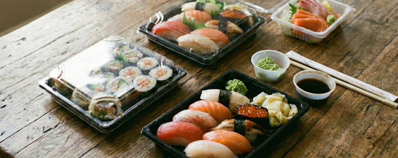 En conjunto, las bandejas con tapa transparente combinan protección, visibilidad y estabilidad, siendo una solución práctica para el transporte y la presentación del sushi.