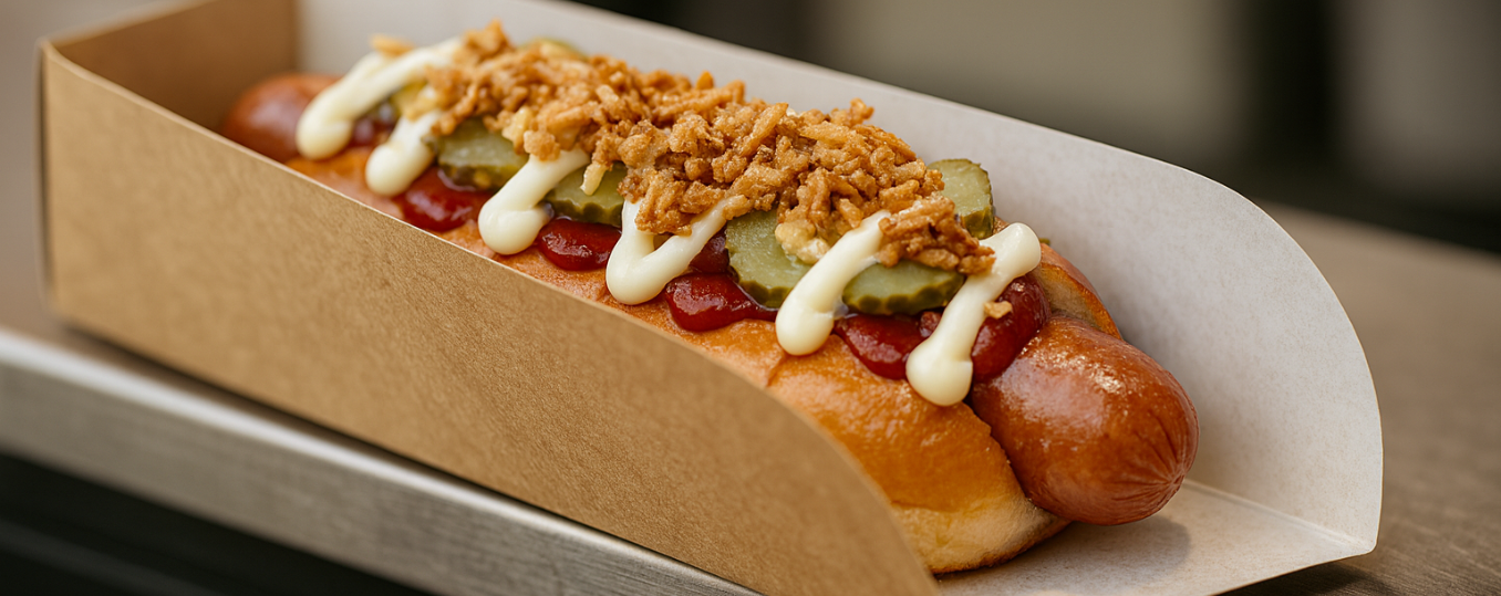 Nuestros envases de cartón están fabricados en materiales de alta calidad aptos para contacto alimentario, con distintos gramajes que garantizan firmeza frente al peso del producto y seguridad durante la manipulación. Son ideales para perritos completos, hot dogs XL, frankfurts largos o versiones gourmet con abundantes toppings como cebolla caramelizada, queso fundido, bacon, pepinillos o salsas especiales.