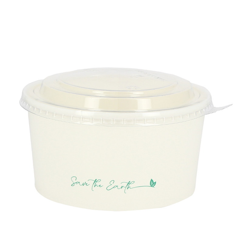 Envase de cartón blanco con tapa incluida de plástico PET reciclado. Es un envase para llevar comidas frÃas. Es estanco y puede contener lÃquidos y salsas. Ideal para dar visibilidad a la comida en hostelerÃa, restauración y foodservice. Para delivery y envase take away.