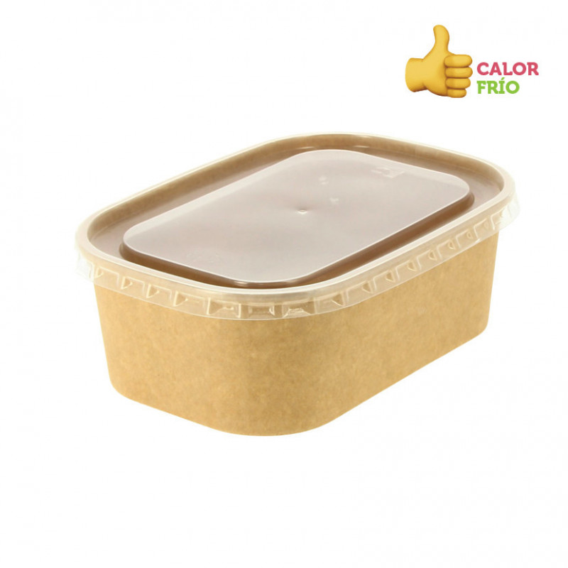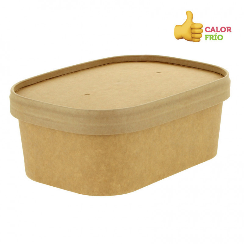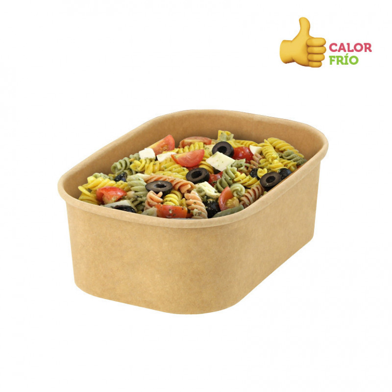 Recipientes kraft para cremes, caldos e comidas frias (750cc). Especiais para pratos de sopa, uma vez que são estanques. Medidas: 17 x 12 x 6cm (largura x comprimento x altura). Recipientes de comida para levar. Adequados para microondas e congelamento. A tampa é vendida separadamente (em PET reciclável e cartão kraft). Consulte tampas para entrega em domicílio em "MAIS INFORMAÇÕES".