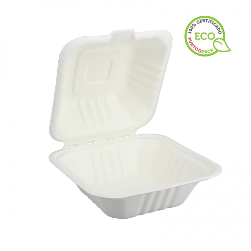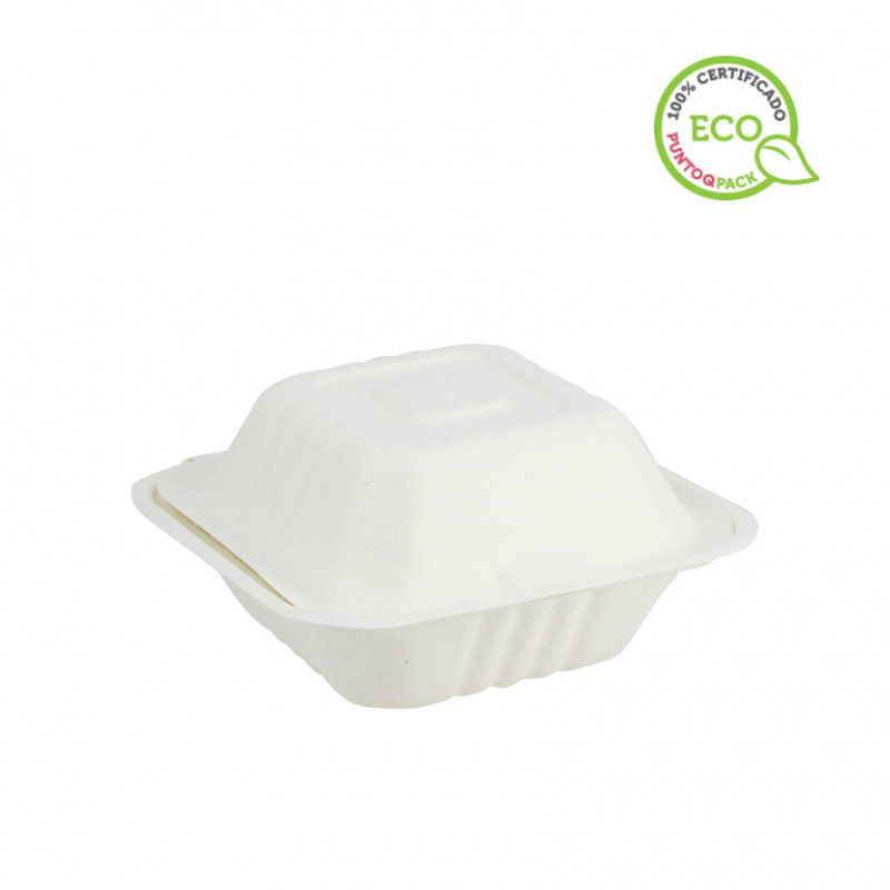 Caixas para hambúrguer feitas de um material totalmente compostável de fibra de cana-de-açúcar. De cor branca e elegantes. Essas caixas de hambúrguer são resistentes a possíveis golpes no transporte de take away e delivery. Ideais para hotelaria, restauração, fast food e food trucks. Embalagem biodegradável.