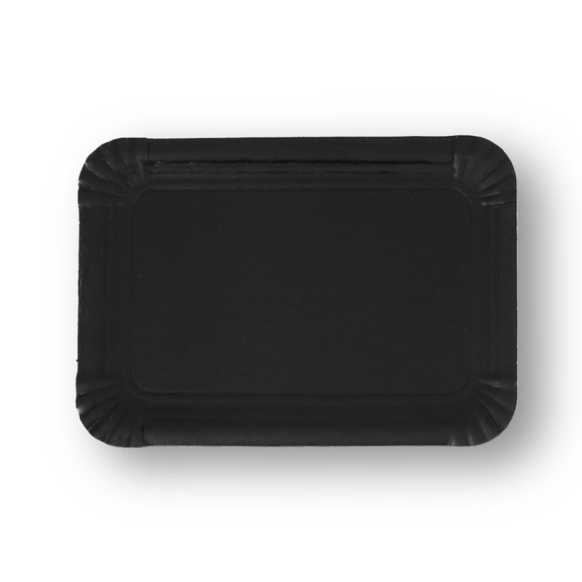 Bandejas de papelão para pastelaria. Adequadas para colocar na geladeira e no congelador, pois o material é um papelão resistente com um laminado especial para suportar a umidade. Trata-se de bandejas de tamanho médio e planas para servir todos os tipos de doces, massas e bolos. Elas são de cor preta fosca e suaves ao toque.