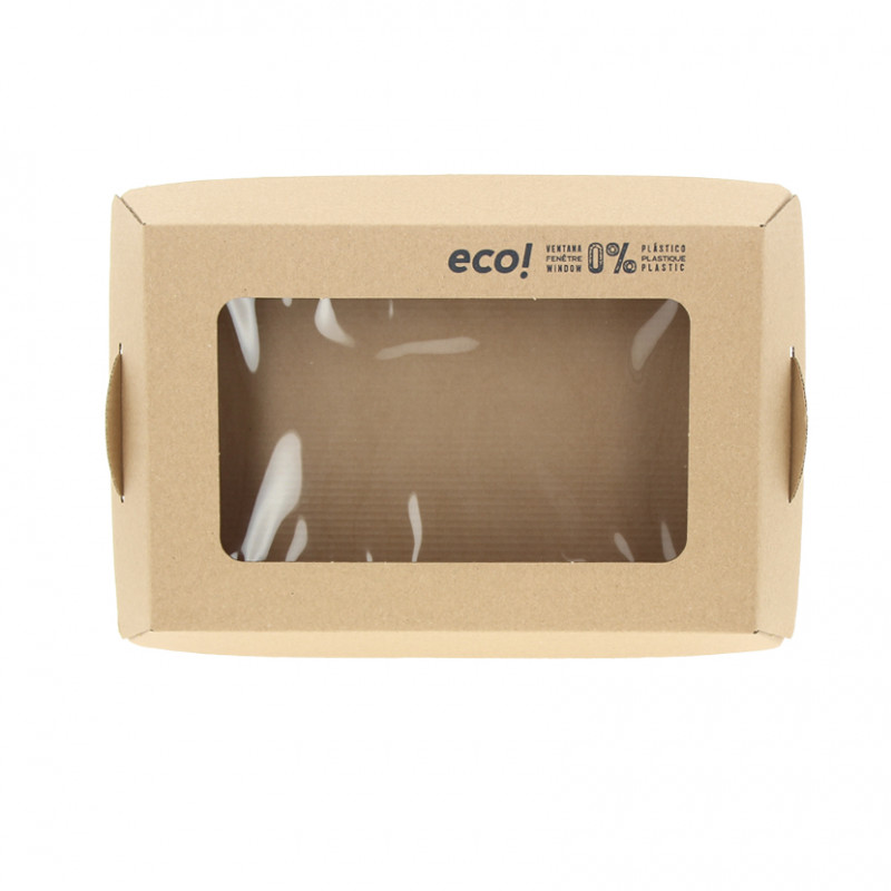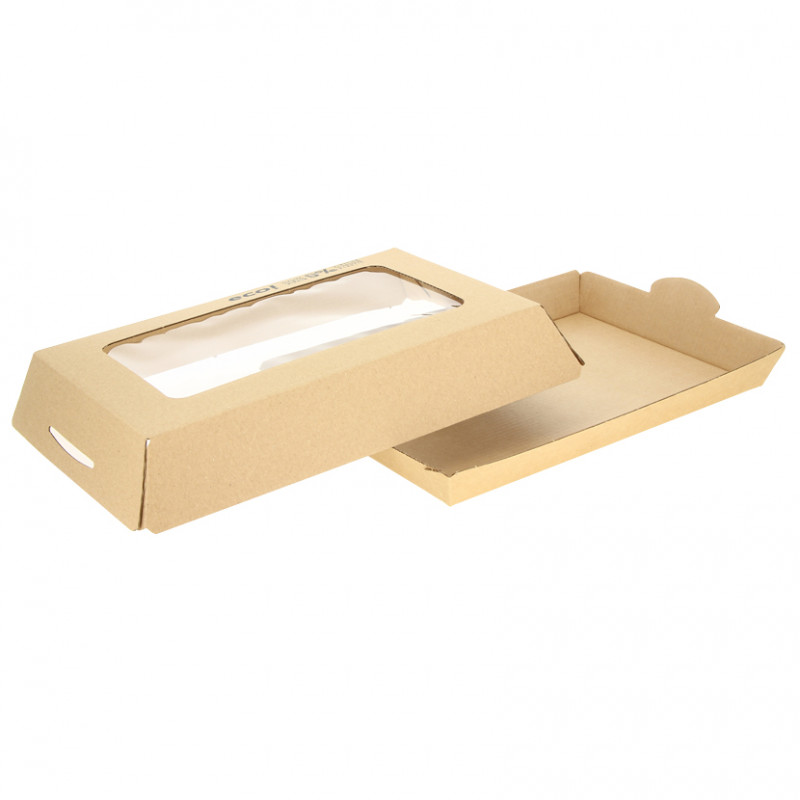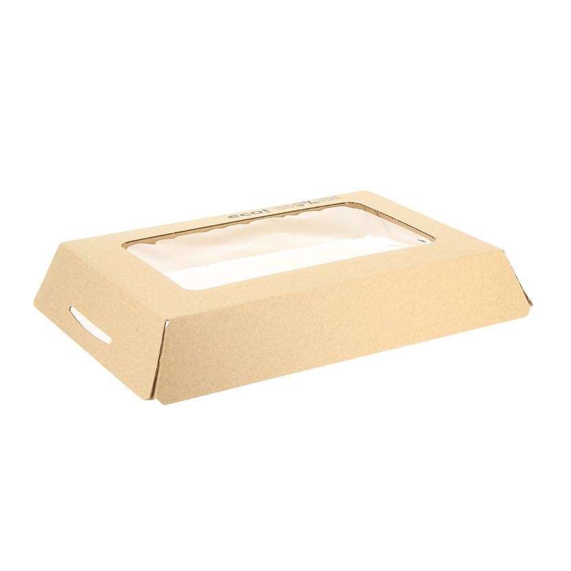Tampa para delivery e take away das bandejas de papelão de catering do seu tamanho correspondente. Esta tampa é única no mercado, pois sua janela transparente é biodegradável. Ideal para conseguir a melhor apresentação em eventos e catering. As bandejas são vendidas separadamente.