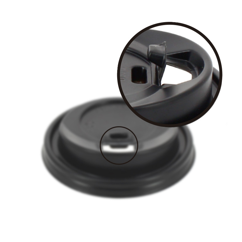 Tampa anti-derrames de cor preta com um novo sistema de abertura e fechamento ao gosto do consumidor. Você evitará derrames inoportunos dos seus copos de café para viagem. Buraco de grande tamanho para beber confortavelmente em movimento. Fabricada em material PS reciclável. Sua tampa funciona como uma abertura/fechamento de mamadeira. Adequada para copos de 8 cm de diâmetro, que você pode ver em "MAIS INFORMAÇÕES".