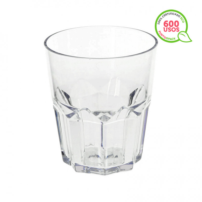 Copo de água de policarbonato, um material inquebrável que é reutilizável. Ciclo de vida útil de 600 usos, pois são adequados para máquinas de lavar louça. Não lascam. Estes copos de água têm a medida padrão de 330ml e são ideais para serviços de alimentação em hotelaria, restauração e catering. É um copo 100% reciclável no qual você pode servir todos os tipos de bebidas frias.