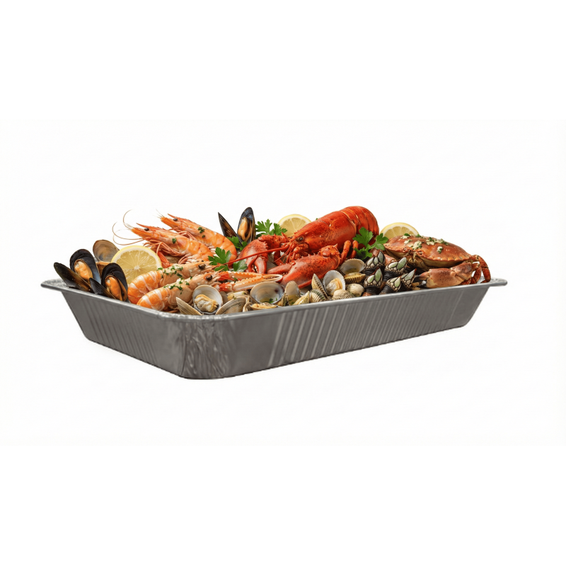 Recipiente de alumínio retangular alongado com capacidade de 8850 cc, fabricado em folhas de alumínio de alta qualidade. Trata-se de um recipiente resistente, ideal para assados, preparações com molhos, pratos com óleos ou gorduras e todo o tipo de elaborações que necessitem suportar temperaturas elevadas. Pode ser usado em forno convencional, grelha, cozimento a vapor, etc. É um recipiente de alumínio com tampa à parte, que permite fechar o recipiente para transportar ou conservar a comida sem derramamentos ou perdas de temperatura.