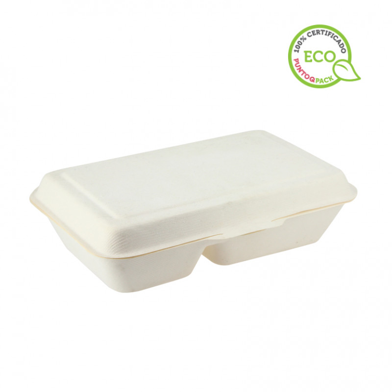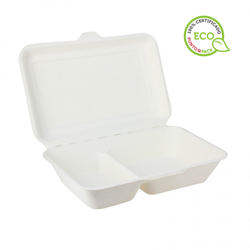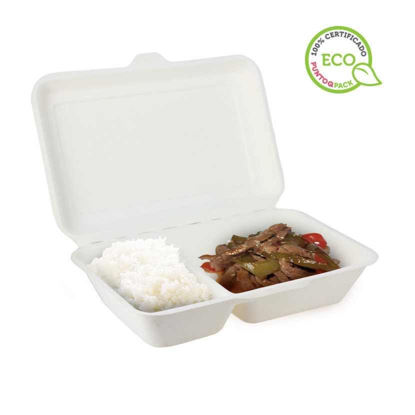 Embalagens biodegradáveis de cana-de-açúcar 100%. Composto por 2 divisões de 650cc e 325cc cada uma. Muito indicado para menus de hambúrguer com batatas ou carne com molho e arroz. Embalagens de comida para viagem de boa resistência graças à sua ótima espessura. Tampa com fecho seguro central para take away e delivery. Design em cor branca.