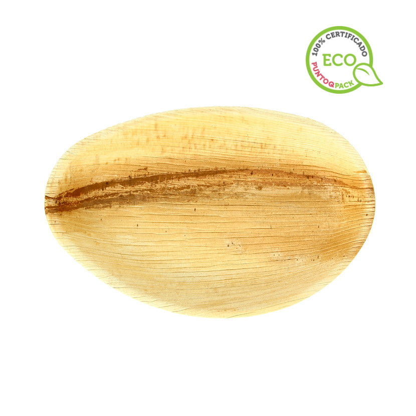 Pratos de folha de palmeira ovais e perfeitos para catering, eventos e serviços de comida em food trucks. Design e aparência totalmente naturais. A base é oval e tem 19 cm de comprimento. São pratos descartáveis biodegradáveis e compostáveis 100%. Uma opção ecológica de madeira para servir aperitivos, alimentos em conserva ou secos.