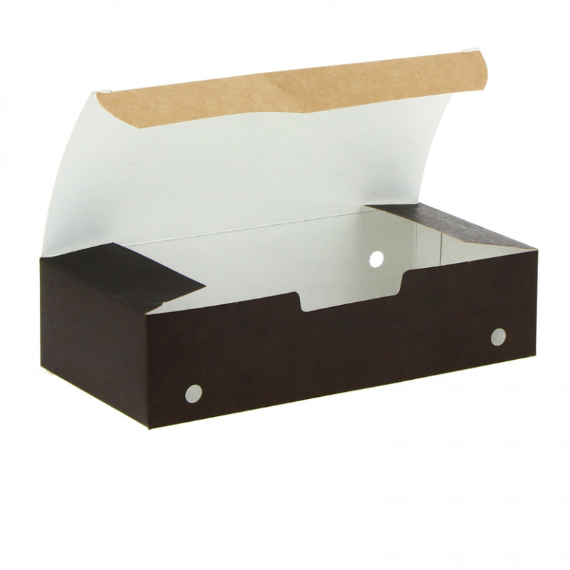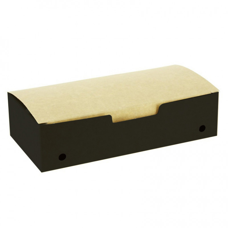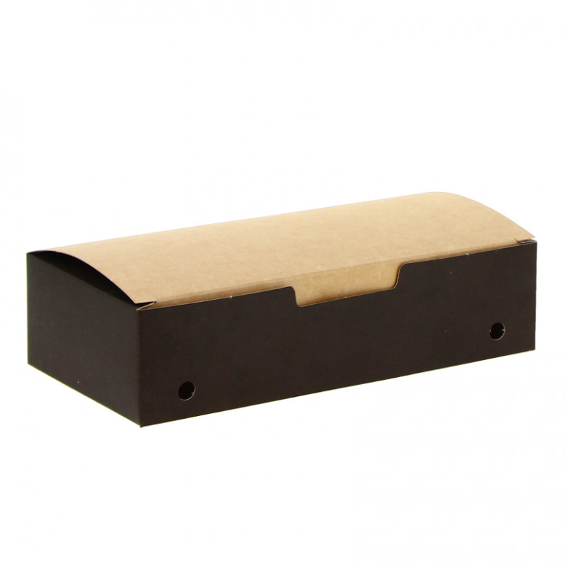 Caixas para porções de fritos como croquetes, lulas e batatas fritas. Estes recipientes para fritos de tamanho grande e alongado são de um papelão com reverso branco. Eles têm várias perfurações para permitir que o alimento respire na entrega e take away. São de cor preta exterior, tampa em kraft e de montagem automática. Fale conosco para obter esta caixa de cartão personalizada.