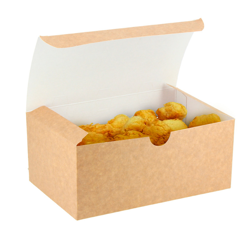 Caixas para fritos e empanados especiais para porções grandes. Estas embalagens de cartão kraft são feitas de um cartão com o verso em branco que possui um laminado interior, embora seja aconselhável acompanhar com papel anti gordura o interior. São de montagem automática, ou seja, empilham-se desmontadas e montam-se de forma fácil e rápida nas mãos. Caixa personalizável. Possuem 3 orifícios de ventilação para conservar e evitar condensações. São embalagens ecológicas.