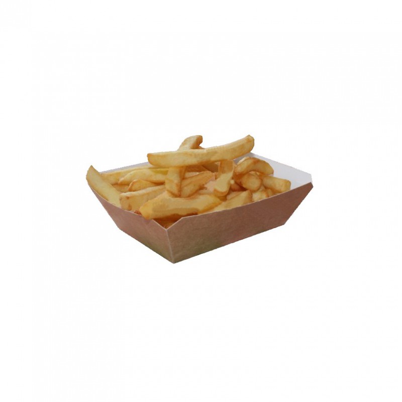 Barquetas de cartón kraft, impermeables y antigrasa de 250ml para pequeñas raciones de patatas, anillos de calamar y otras frituras. También conocidas como barquillas o bandejas de cartón. son los envases para fritos por excelencia. Con interior blanco laminado, impermeable y antigrasa para contener la grasa y mantener las manos limpias. Sus paredes altas te permiten apilar los fritos, para que no se caigan mientras caminas. Cada barqueta de comida para llevar es personalizable con tu logo o marca.