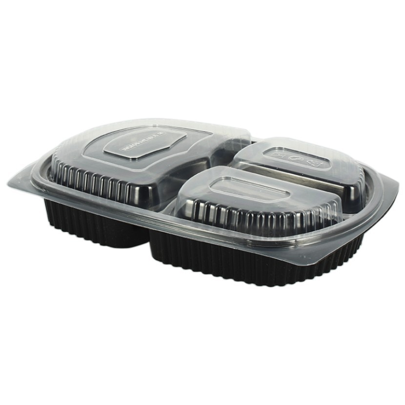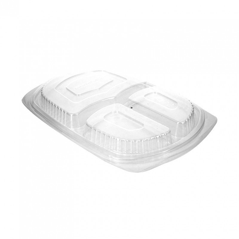 Tampa dos elegantes recipientes de plástico para alimentos de 3 divisões com base preta. São tampas de excelente qualidade, feitas em material translúcido para ver o conteúdo. Muito flexíveis e resistentes. Tampas para microondas e reutilizáveis após a lavagem. Encaixe hermético e 100% seguro.