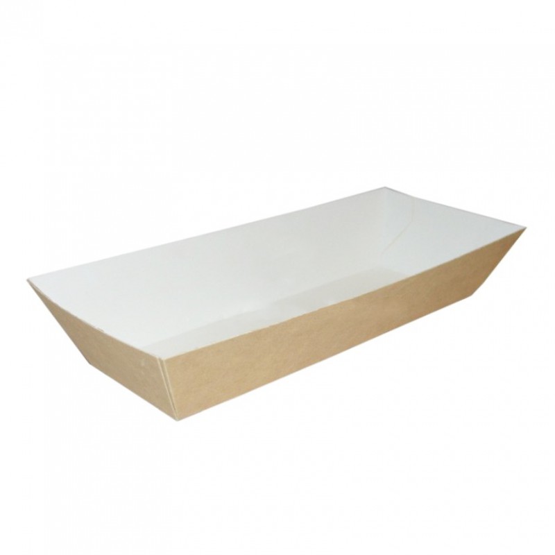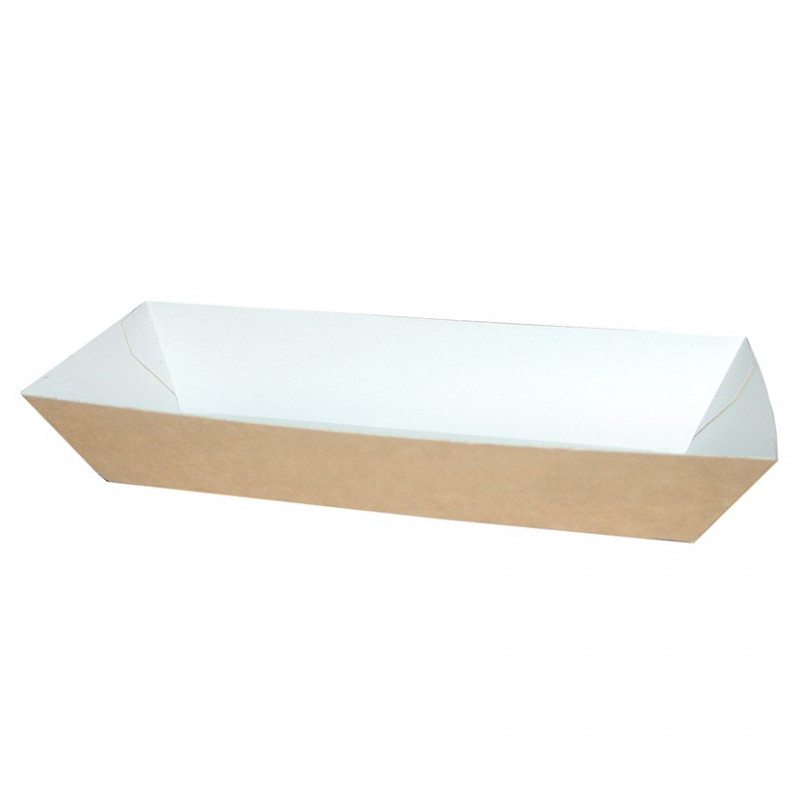Embalagens para cachorro-quente em formato de barquinho feitas de resistente cartão kraft. Umas sólidas embalagens para cachorro-quente perfeitas para transportar o cachorro-quente de forma mais confortável e segura ou para servir fritos.