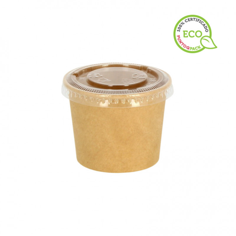 Taças para molhos de cartão ECO kraft com capacidade para 90ml (3oz). Válidas para molhos quentes e frios. Tampa válida para todos os modelos destas embalagens! São taças ecológicas para molhos de fast food. Tampa em cartão ou em PET que é 100% reciclável e transparente, que oferece um fecho muito hermético. TAMPAS NÃO INCLUÍDAS.