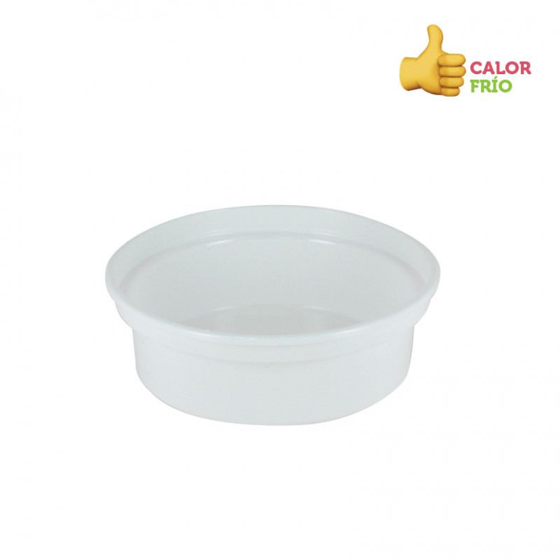 Recipiente circular PP branco de 250 cc. Recipiente para comida quente, que suporta líquidos e pratos muito quentes. Quantidade: 600 Und/Caixa. Capacidade: 250 cc. Medidas: 10 x 13 x 4 cm (Base x Boca x Altura). Tampa opcional.