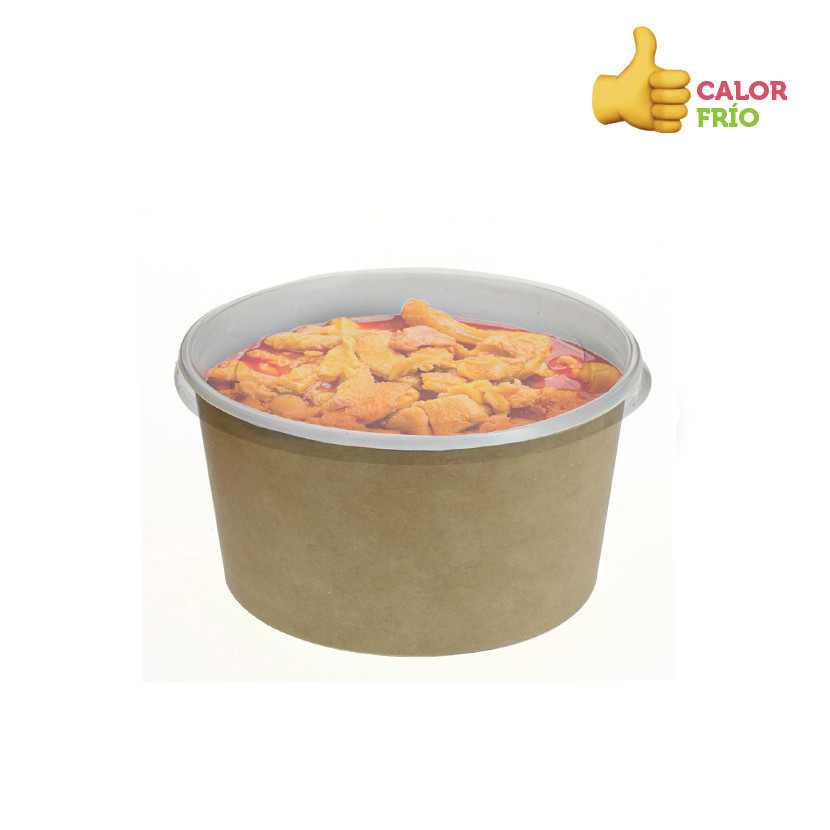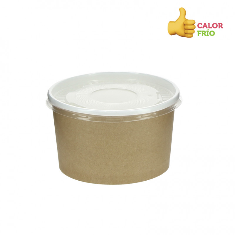 Taça de cartão decorada de kraft que é tipo estanque. Vem com tampa de PP resistente e flexível. Esses recipientes de cartão contam com um laminado para conservar gorduras, caldos e óleos. As taças podem ser seguradas na mão pois têm um tamanho para pequenas quantidades de comida. Seus produtos serão mantidos da melhor maneira graças também aos furos de respiração que as tampas têm. Recipiente personalizável.