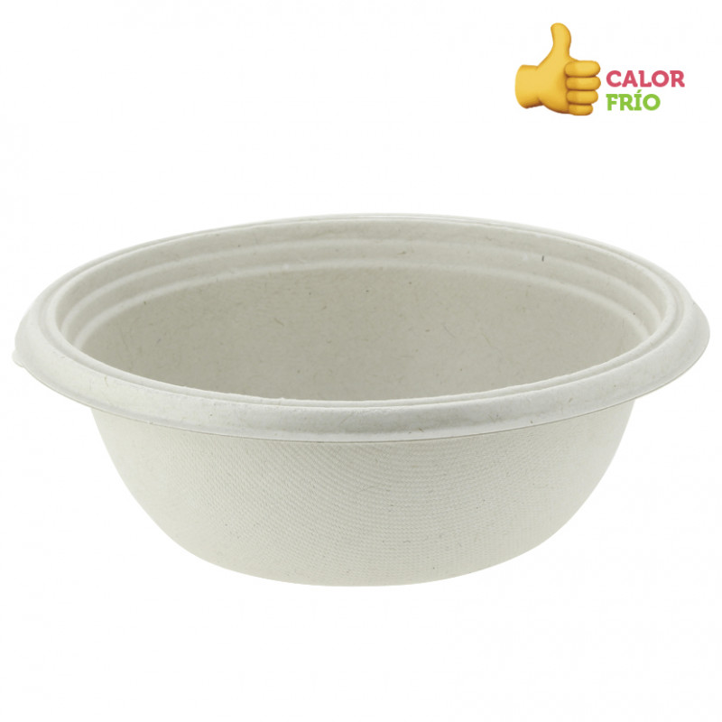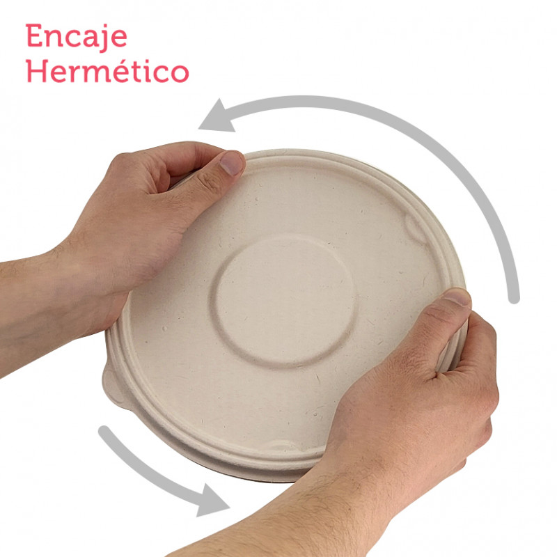 Saladeira de fibra de grande tamanho e de material super estanque. Não deixa passar o líquido, temperos ou molhos, graças a serem recipientes impermeáveis. É uma saladeira válida para pratos frios e quentes. São os recipientes biodegradáveis redondos de maior capacidade para take away e delivery. As suas tampas de encaixe hermético são vendidas separadamente. Recipiente para microondas.