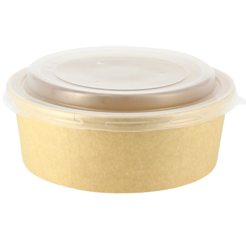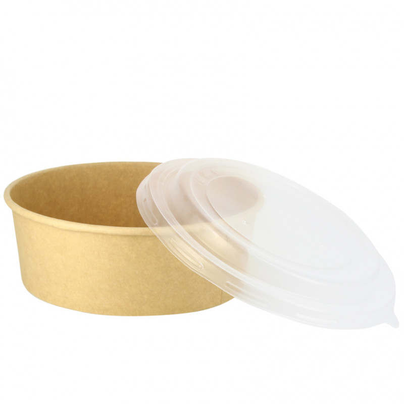 Tigela de papelão biodegradável com tampa PP reutilizável e translúcida.