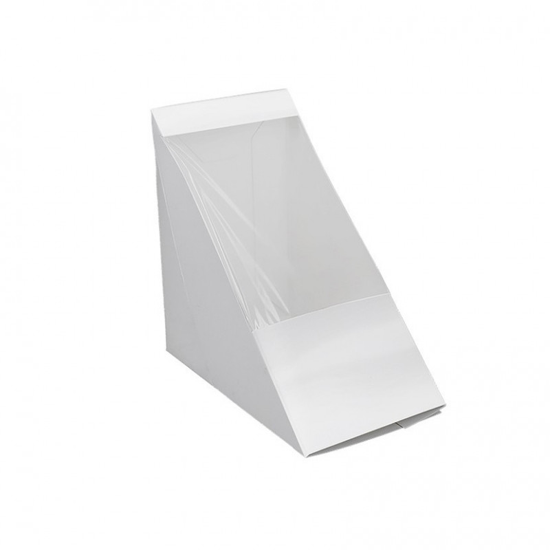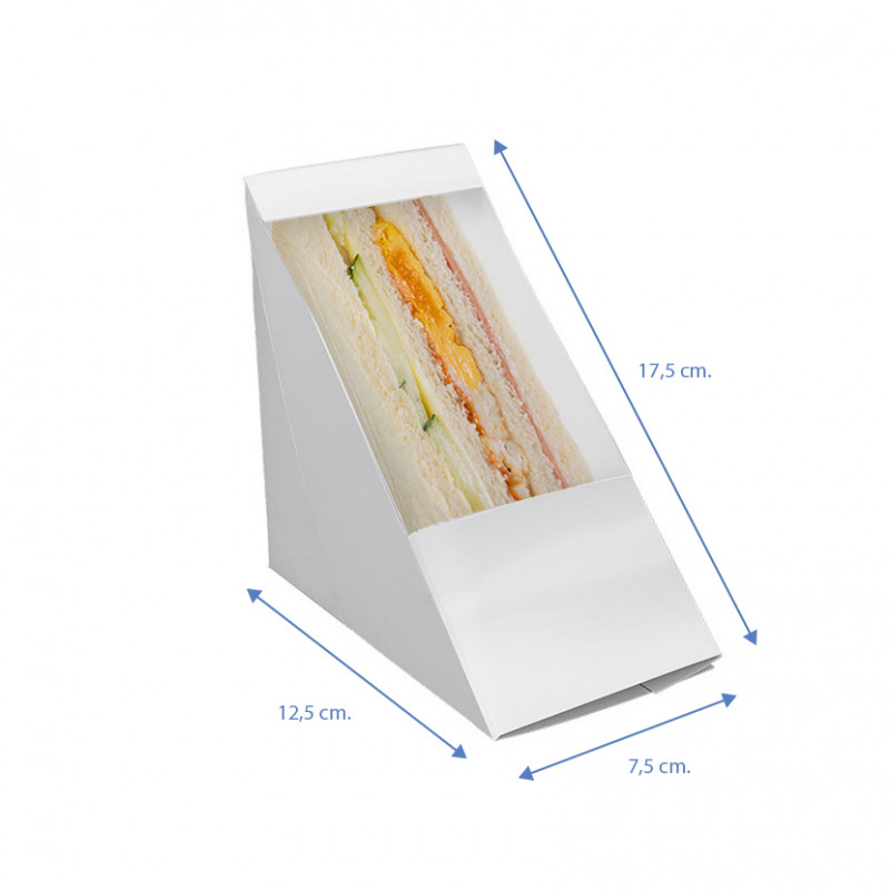 Embalagens para sanduíches duplas fabricadas com papelão alimentar na cor branca e janela transparente. Além disso, estas embalagens para sanduíches possuem um simples sistema de abertura e fechamento. Medidas: 17,5x12,5x7,5 cm.