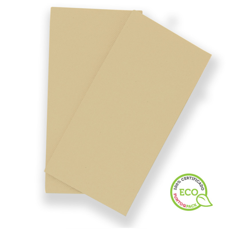 Guardanapos ecológicos dobrados de qualidade fofa e super absorvente. São de formato ponta a ponta (pp) de 30 cm x 40 cm. Estes guardanapos de papel provêm da reciclagem, são biodegradáveis e compostáveis 100%. A cor resultante é creme e a textura em contato com a pele é muito agradável. Oferece uma imagem de respeito pelo meio ambiente com estes guardanapos de papel reciclado pensados para take away, delivery, serviço de alimentos e consumo local.