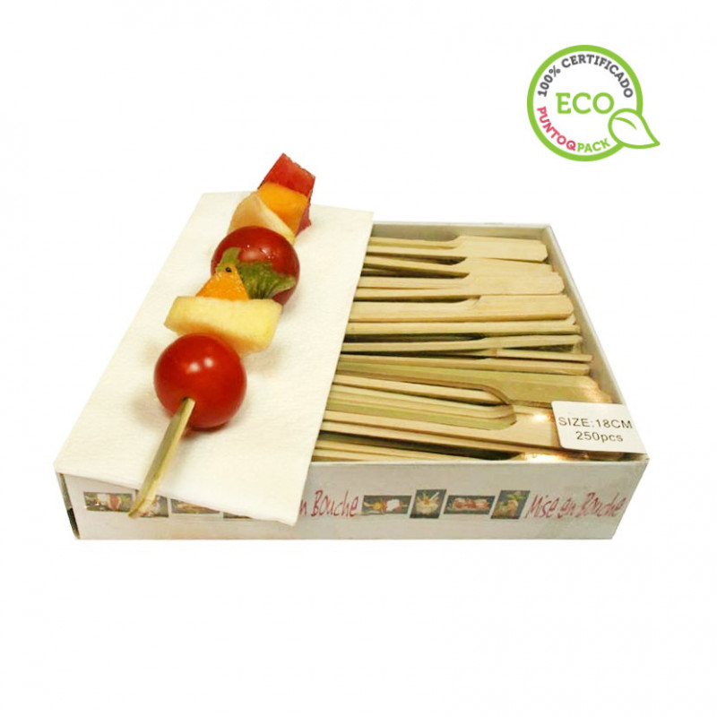 Palitos para espetadas de bambu estilo bastão, 18 cm de comprimento. Perfeitos para apresentar todos os tipos de petiscos e tapas. A sua extremidade plana torna mais fácil e confortável a pegada das espetadas. São feitos com madeira ecológica de bambu; uma planta de crescimento rápido e muito fácil de renovar, ideal para a indústria. Ao usar estas espetadas de bambu, evitamos a derrubada de florestas tropicais e ajudamos a preservar o planeta.