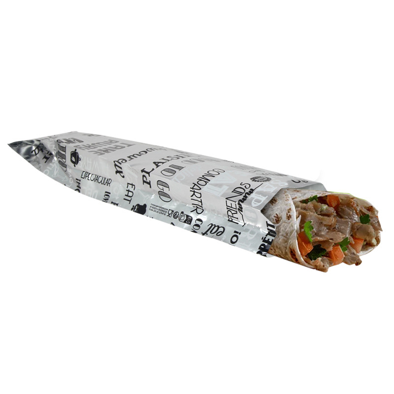 Saco para produtos quentes e frios da famÃlia Silver em papel alumÃnio externo e interno branco. Fecho fácil ao dobrar o alumÃnio, é um saco fantástico para baguete, durum, hot dog e fritos. Especial para colocar na chapa quente e manter a temperatura do produto quente por mais tempo. Não pinga, pode conter molhos e óleos.