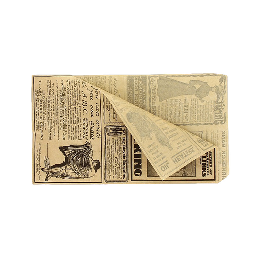 Saco kraft decorado aberto em ambos os lados anti-gordura. Ideal para waffles, sanduíches, pastelaria, sanduíche, etc. Papel anti-gordura cujo revestimento é fino mas muito eficaz. Dê um toque elegante às suas embalagens em hotelaria e restauração, seus clientes agradecerão. Medidas de 13x23cm.