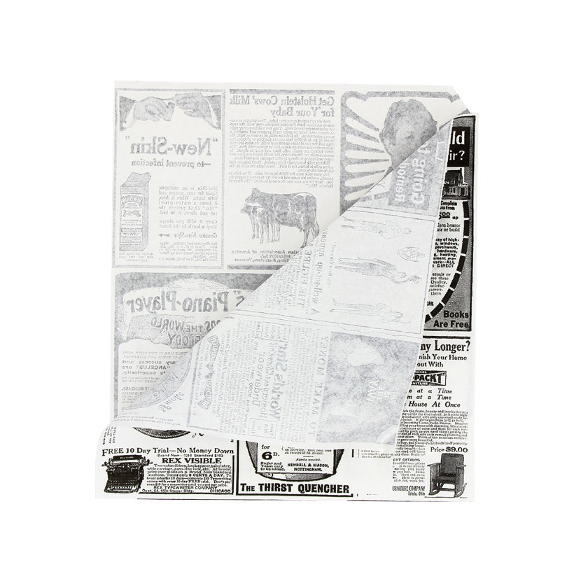 Papel para hambúrgueres anti-gordura com design de jornal de 17x17 adequado para qualquer tamanho de hambúrguer. Totalmente anti-gordura para facilitar o consumo, permitindo comê-lo "on-the-go" sem se sujar com molho ou gordura. Design elegante vintage.