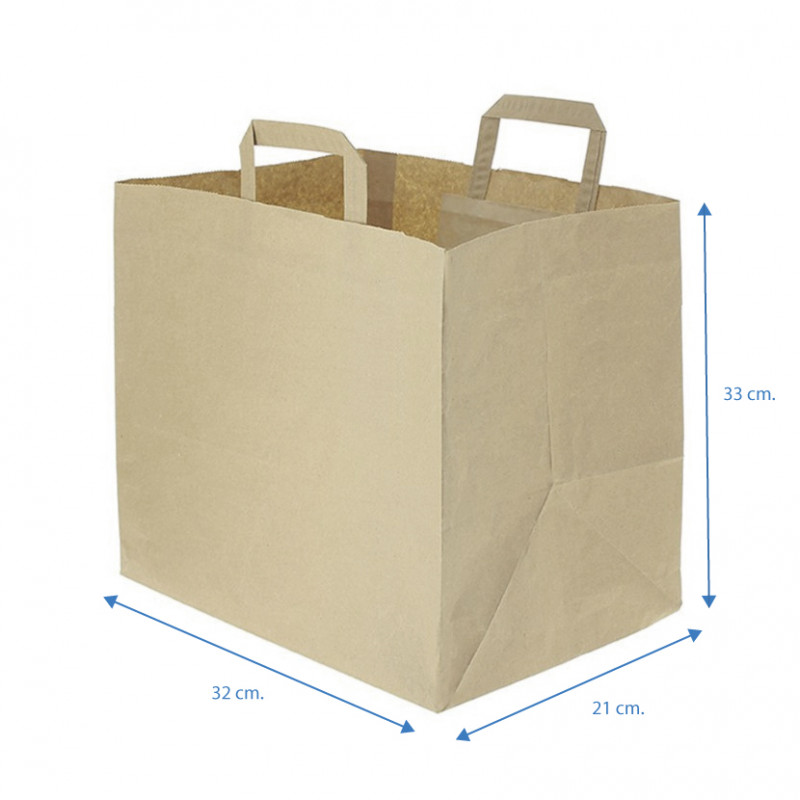 Sacos de papel com certificado FSC. A melhor opção para take away e delivery, pois é um saco biodegradável e ecológico. São de fundo largo e altura extra para colocar as suas embalagens de comida para levar e menus. Sacos de papel com alças planas perfeitas para serviço de entrega em domicÃlio. Sacos personalizáveis.
