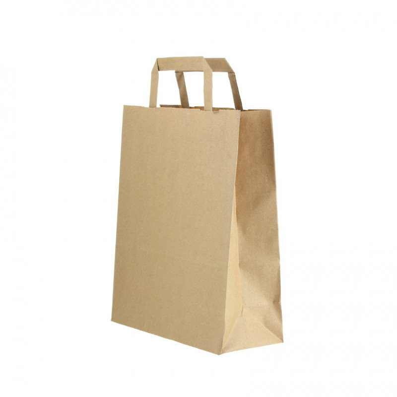 Sacos de papel kraft reciclado com alças planas e certificado FSC. Muito usado por negócios de alimentação para colocar alimentos pequenos. Também muito usado por farmácias, lojas de roupas e outros comércios. São sacos ecológicos, biodegradáveis e 100% recicláveis. Consiga seus sacos personalizados a partir de 250 unidades