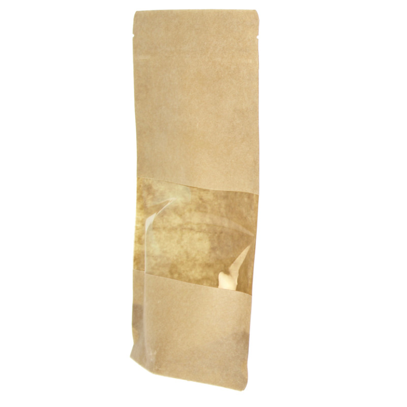 A Bolsa Doypack com janela extra grande é perfeita para negócios que precisam armazenar e exibir grandes quantidades de produtos. Suas dimensões (20+7x30 cm) a tornam ideal para legumes, massas ou produtos desidratados. O papel kraft plastificado e sua laminação interna de PE garantem proteção contra a umidade. Seu duplo fecho superior, com um zip re-selável, oferece segurança adicional.